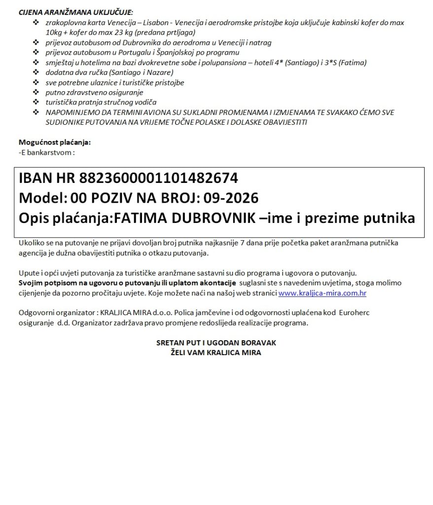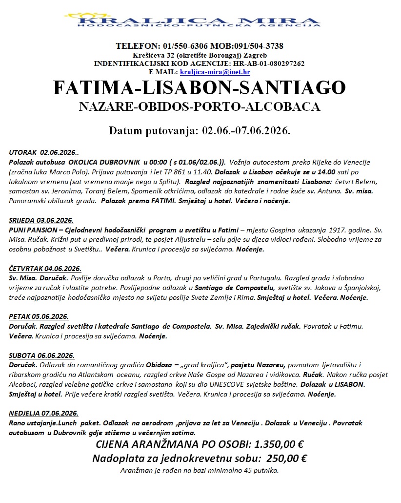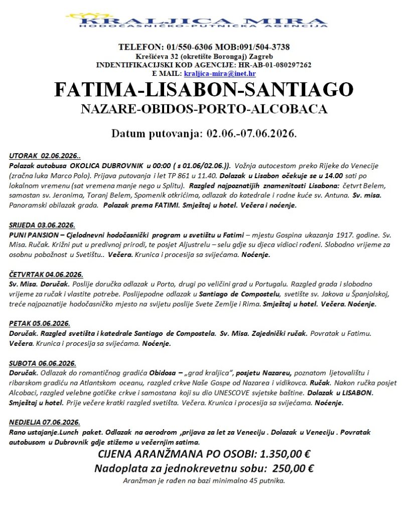 Hodočašće u Portugal, 2.-7.6.2026.